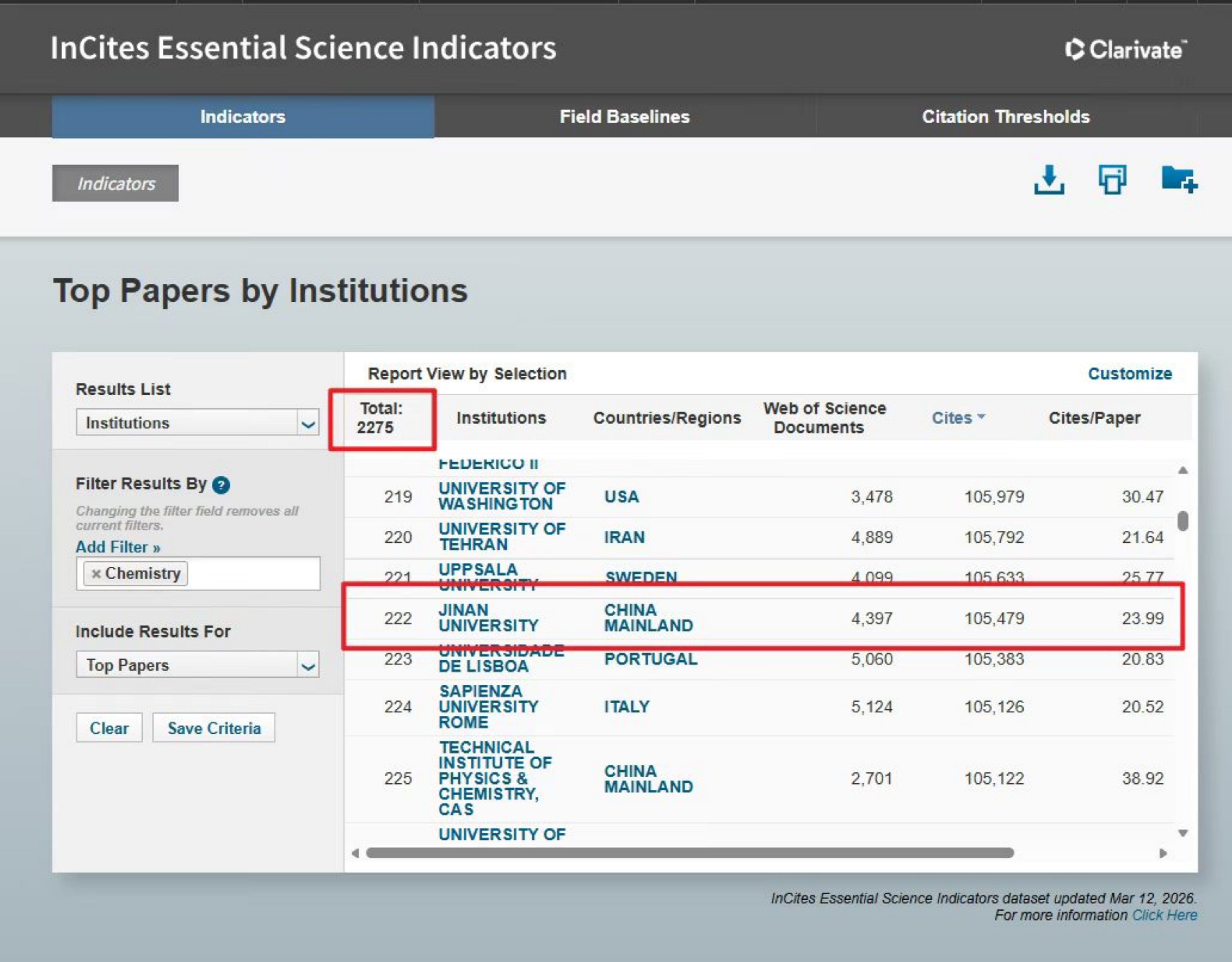 我校化学学科进入ESI全球前1‰
