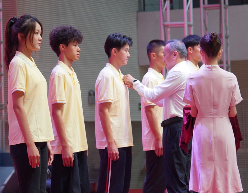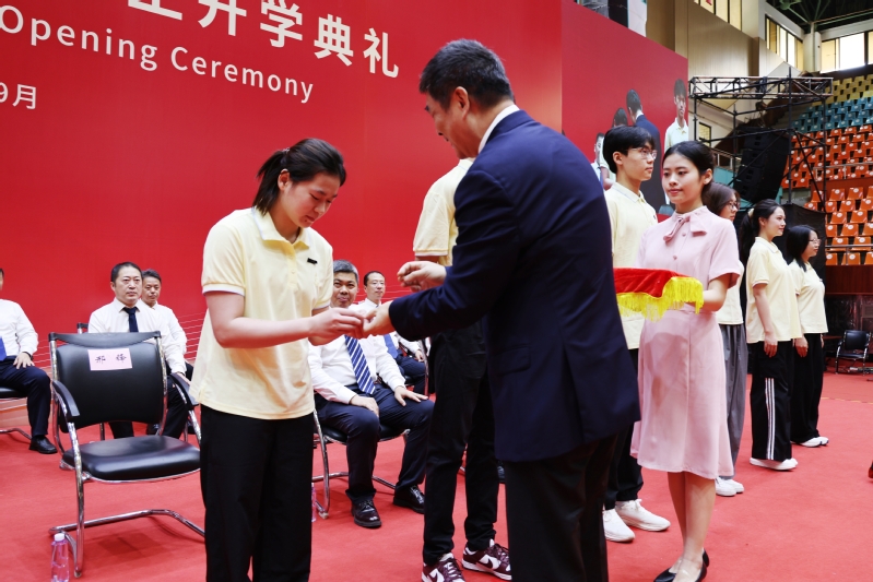 开学典礼上,校党委书记孙彧,中国工程院院士、校长邢锋,副校长张宏,校党委副书记陈莹分别在三校区为新生代表佩戴校徽,共同为新同学们完成属于“暨南人”独有的身份认证。