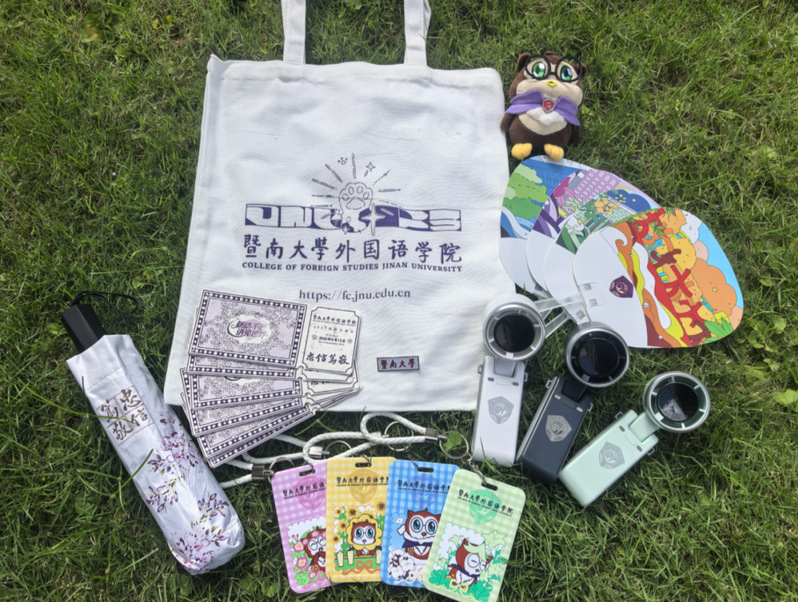外国语学院为新生准备了丰富而实用的迎新大礼包,包括定制帆布袋、小风扇、外院学子设计的暨南四季凉扇、“暨小外”四季卡套、“‘新’动不已 ‘语’见世界”种子纪念卡,以及外院定制晴雨伞等,用富有学院特色的创意设计迎接新生的到来。