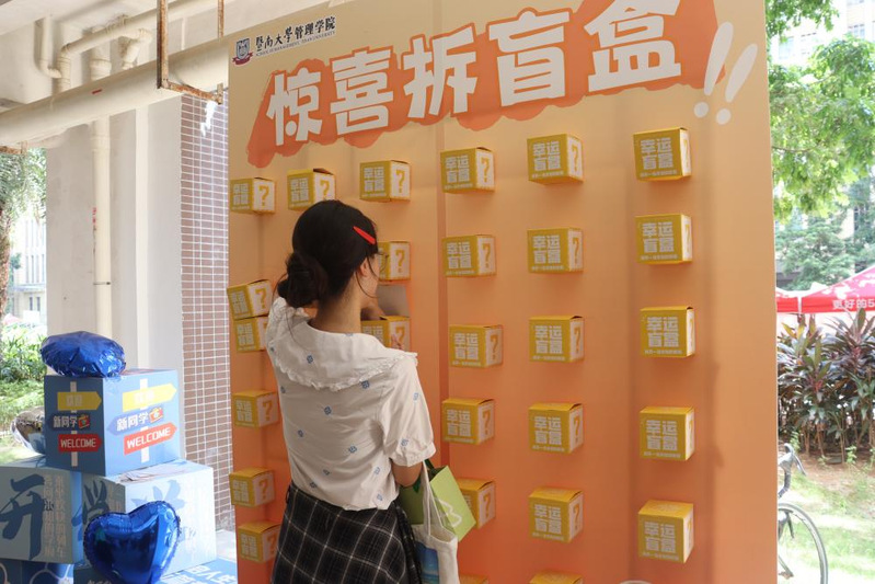 管理学院以活力满满的原创IP“管小虎”迎接本科新生,设计出多款实用型文创产品。在“开学有礼·盲盒墙”互动装置中,每位新生都能抽取定制盲盒,收获“入学礼”。对于研究生,学院设置了创意互动展板,通过“拍一拍”方式实时更新并记录新生的报到顺序,用即时摄影服务记录下入学第一瞬间。