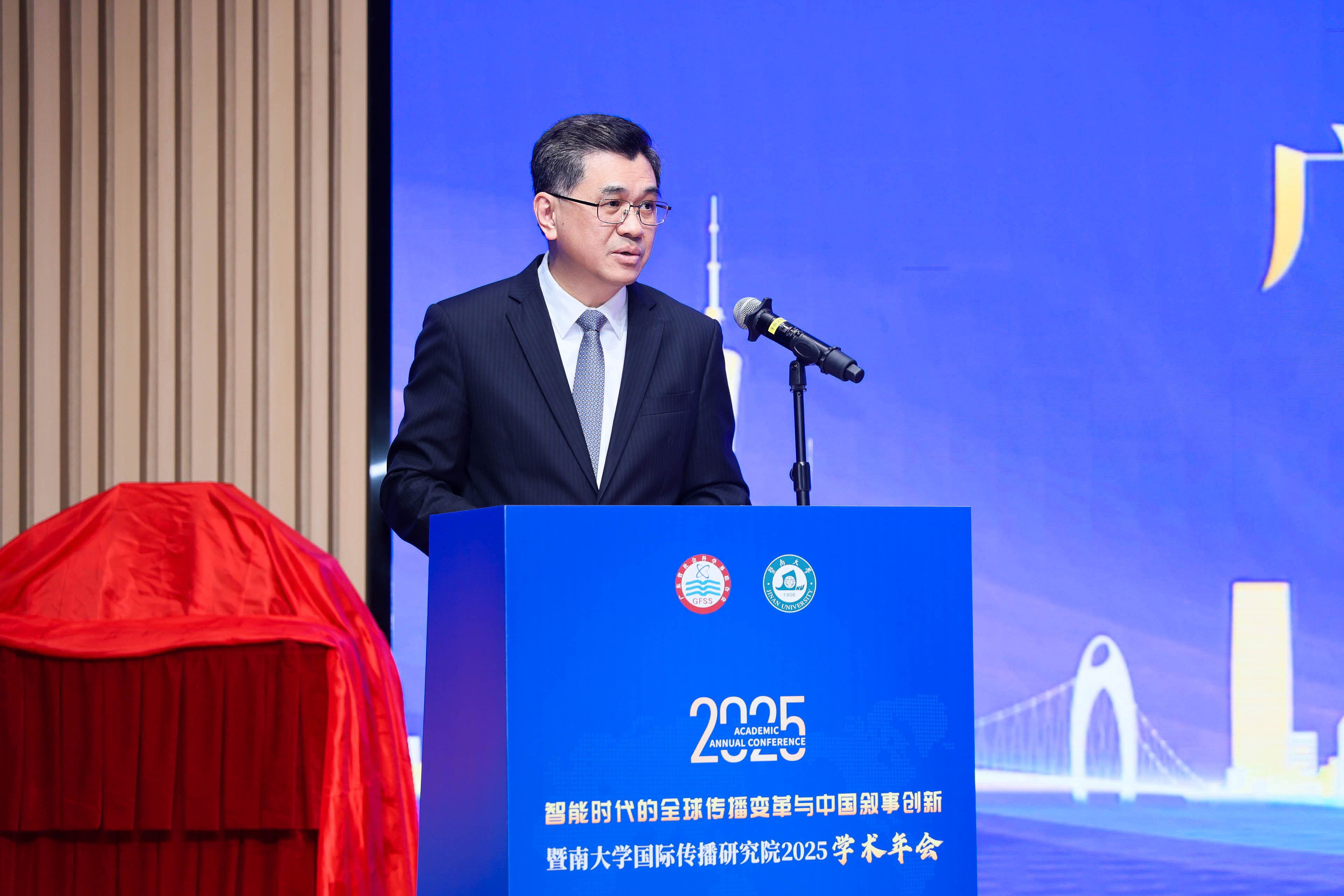 暨南大学党委书记孙彧在致辞中回顾了暨南大学依托侨校特色开展国际传播研究的创新实践。他指出,暨南大学是中国第一所由国家创办的华侨学府,在新时代背景下,学校牢牢把握“侨校+名校”的发展定位,将国际传播能力建设作为核心使命之一,主动融入国家战略,在推动中国故事、中国声音的全球化表达中,发挥着不可替代的独特作用。我国国际传播已进入“提质增效、守正创新”的关键阶段,面对新形势新任务新要求,暨南大学将发挥侨校优势,为国际传播工作贡献暨南智慧和暨南力量。