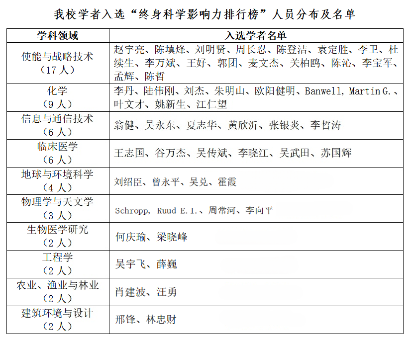 (我校学者入选“终身科学影响力排行榜”人员分布及名单)