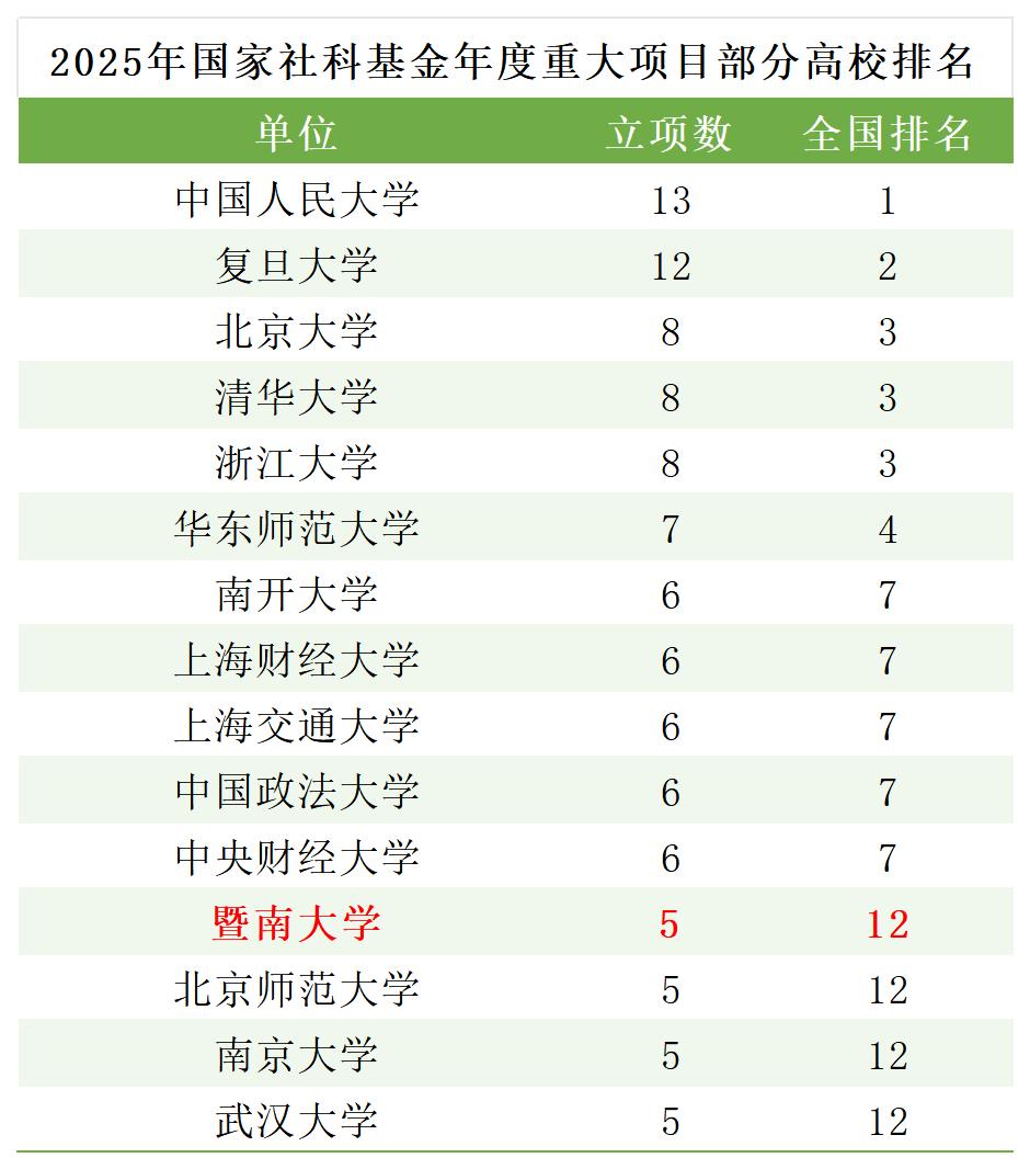 在2025年国家社科基金年度重大项目立项名单中,暨南大学获批5项,立项数居全国第12位,广东省第1位。在2025年国家社会科学基金年度项目立项名单中,暨南大学获批46项,立项数位列全国第13位,获批量创历史新高。